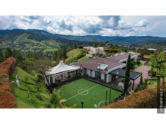 Pesos ColombianosCasa campestre Moderna ubicada en el Retiro Antioquia 22km a Medellin aprox 55 minutos. casa en condominio unidad cerrada. área de terreno 2.400m2 área construida 620m2. 5 habitaciones con baño. dispositivos de seguridad como cámaras de seguridad, sensores, paneles solares para iluminación exterior. jacuzzi para 6 personas. turco para 10 personas. cancha sintética con grama y drenaje de 10x 12 aprox. pisos en porcelanato. zona de ropas, estudio, domotizado el sonido, luz y blackout en todas las ventas video beam. venta amoblada. parqueadero cubierto para 2 vehiculos descubierto para 9 vehiculos. 7 años de construida. estrato 6. administracion mensual COP$413.000. impuesto predial